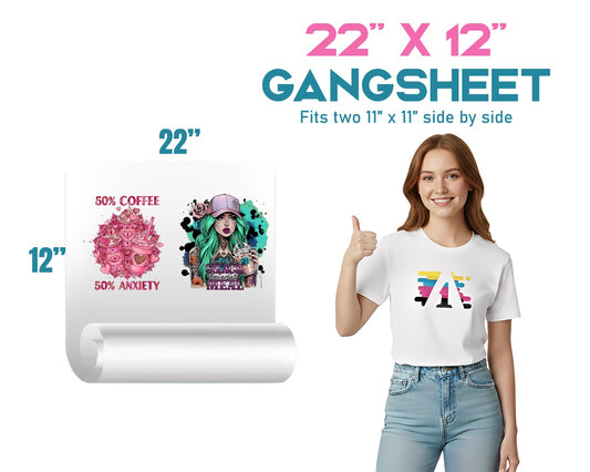 Upload by size, by gang, or create a gang sheet. Boundless possibilities! We will produce the highest-quality DTF transfer for you.